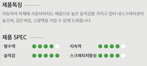제품특징 - 자동차의 유리에 사용되는 발수, 유리강화 제품으로 탁월한 발수력을 바탕으로 우천시 시야확보에 도움을 주며 유리가 강화되어 날라드는 돌, 기타물질에 의해 생길 수 잇는 데미지를 최소화 할 수 있습니다.